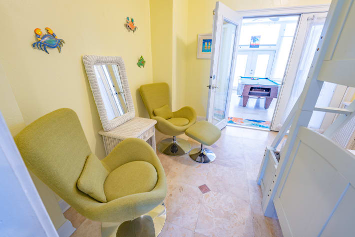 Just beyond the dining area, a stairwell opens onto the top floor suite, a comfortable space for a small family or older children. The suite includes a convenient mini-fridge, microwave, coffee maker and Double bunk bed as well as access to a covered balcony overlooking the private pool. Thru this room is a Gulf front Master bedroom with King bed, Daybed w/ trundle and full bathroom with shower. A private balcony completes this space with Gulf and beach views.