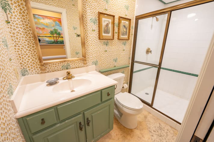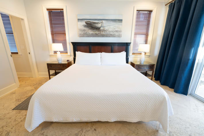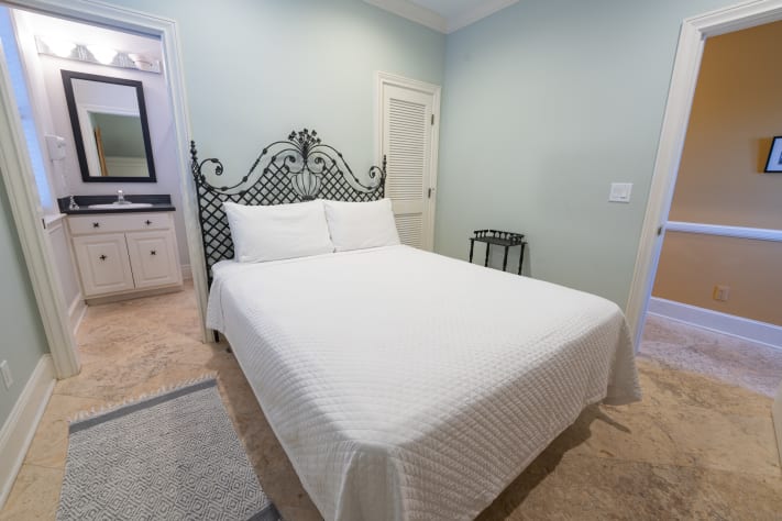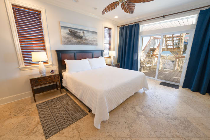 As you enter into the 1st floor, you will find two bedrooms, one of which is a Beachfront master suite with King-sized bed. This rooms opens onto a private, furnished and covered deck with access to the ground level and beach boardwalk. You can enjoy spending the early morning here as the sun rises over the Gulf or you may choose to venture out into our palm garden for the fresh Gulf air. A private bathroom with walk in shower completes this master suite.