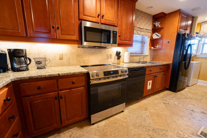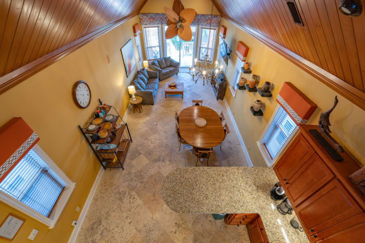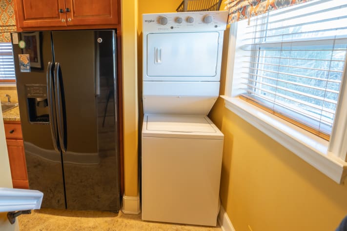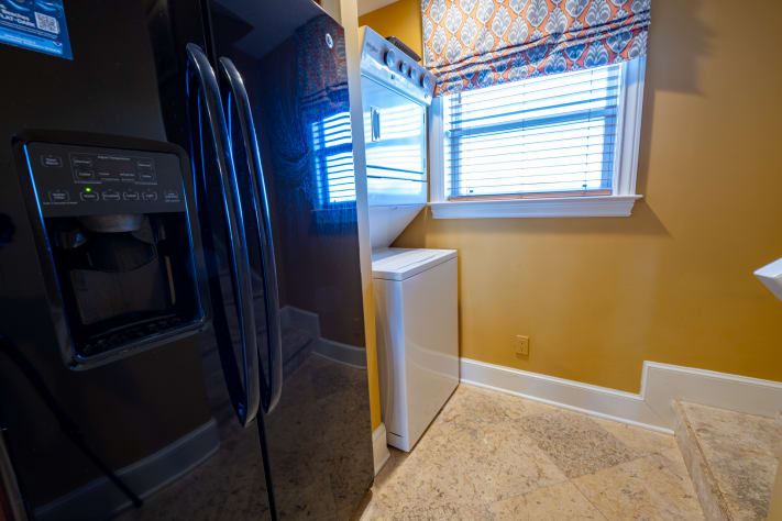 The second floor is the shared living space and holds the best views in the house. You will find the kitchen well stocked and ready for you to prepare a meal of fresh, local seafood. A large breakfast bar with seating for 4 and granite countertops make this an easy gathering place before heading out for the day. A laundry area is also conveniently located just past the kitchen.