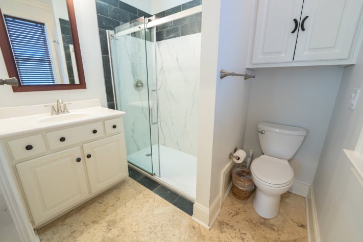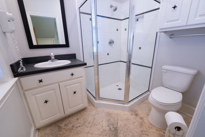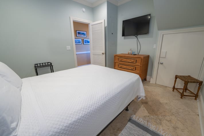 The second bedroom is tastefully decorated, with a Queen bed and private bathroom with large, tiled shower. All of our bedrooms have the added convenience of a flat screen TV and ceiling fan for your comfort.