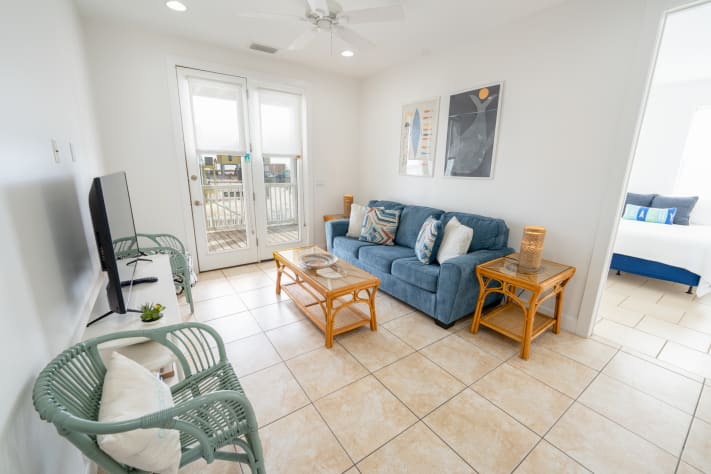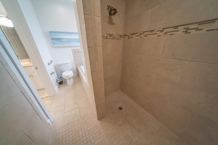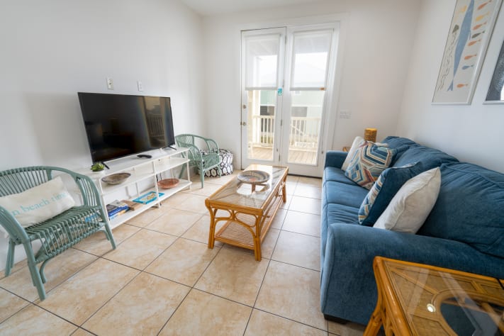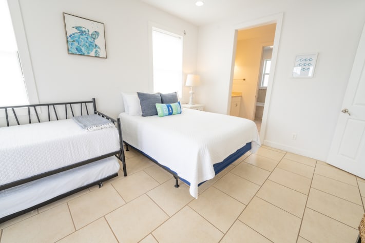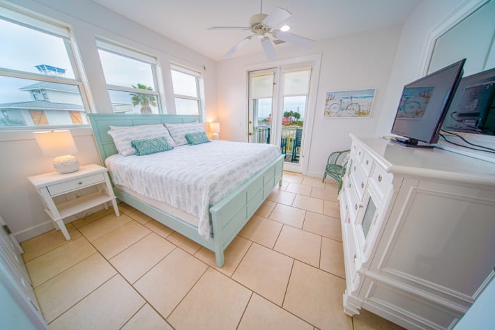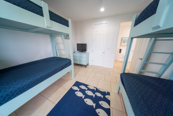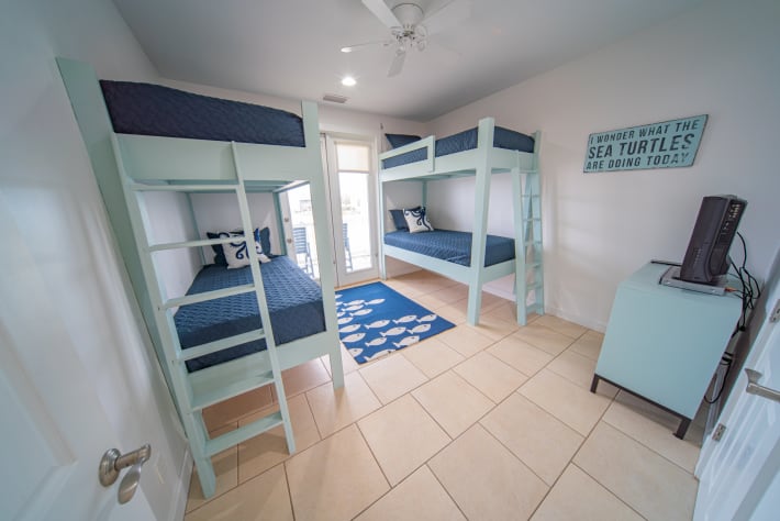 Downstairs you’ll find an additional TV space with Queen sleeper sofa and access onto a furnished covered deck with daybed swing overlooking the Gulf of Mexico and private pool. The first of 3 bedrooms on this floor has a Queen sized bed, twin bed w/ trundle pull out (2 twins), TV, access to the covered deck and a private bathroom with double vanity, jetted tub and roll-in shower. The bunk bedroom has two tall bunks (4 twins), TV and deck access. The last bedroom has a King sized bed, TV and access onto the covered deck. A large shared bathroom at the end of the hall features a double vanity and roll-in shower.