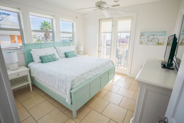 Relax into the softly hued top floor living area with comfortable seating and large, flat screen TV and DVD player. The large kitchen features stainless steel appliances, dedicated panty, large breakfast counter with additional seating and plenty of space for multiple chefs. The dining table can seat up to 10 with additional dining on the screened-in porch. The covered and furnished deck with daybed swing is the perfect spot to enjoy the sunrise and vast water views. The top floor Master bedroom has a King sized bed, deck access, TV and private bathroom with double vanity, jetted tub and separate, tiled roll-in shower.