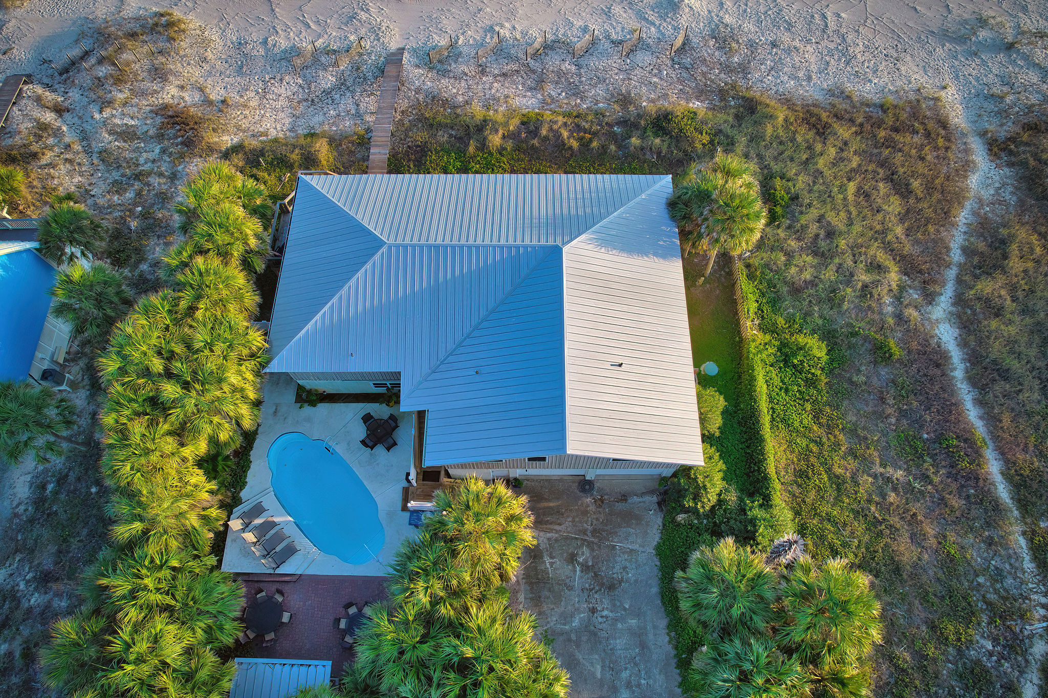 Saturday to Saturday Rentals Only, Please. Beach front living on beautiful St. George Island, mere steps from the ocean via your own private boardwalk: Breathe Easy, surrounded by over forty mature palm trees, is the family-friendly home that will make your vacation holiday special. Upscale furnishings and flat-screen tvs are found in the two separate living areas; over 3400 sf means lots of room for extended families. Upstairs, the large, open-house plan provides over 1200 square feet of family space, which includes a living room with two over-sized couches and adequate seating for your group; dining for twelve; well-equipped kitchen, with Viking 48" gas dual-fuel six-burner range with double oven, French-door refrigerator and farm sink; and another gathering area with additional seating and a game table for six. The expansive balcony provides outdoor easy living, whether watching the dolphins or the kids playing on the beach or in the Gulf. Seating in this area includes a small table and chairs for morning coffee while watching the dolphins and a large cushioned, sectional for lounging anytime. The three bedrooms upstairs have king-size pillow-top mattresses, with all three having private bathroom access. The downstairs second living area has a morning kitchen with an additional full-size refrigerator, microwave and another Keurig coffee-maker. DVDs, books, and games are also available. Bedrooms downstairs include one with king-size bed and the other, a children's bunk room, with two bunk-beds. An additional bath with large shower is located in this area. Surrounded by more than twenty mature palms and other native vegetation,the pool area provides both a gas Weber grill and a charcoal grill option with dining tables and chairs for twelve. The pool may be heated for a fee ($350), if outside temperature permits. The large pool area provides a resort-style getaway, with both a sun deck and covered cabana and lounge chairs for six. We hope you will have a wonderful holiday and because we live on the Island, we are available during your stay. Security Cameras (focused on public, entrance areas only) are in use at the home. Please inquire about Pet (dogs, only please), as to breed/size. Pet Fee $250.
