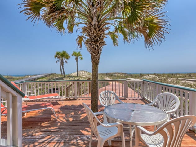 Upstairs you will walk into an open living area with Queen sleeper sofa and high ceilings. Here, you can relax into the comfortable furnishings or walk out onto the beachfront covered deck with an additional sundeck to delight in the warmth of the sun. The upper deck has a gate which closes access to the lower decks so you can keep a closer eye on your pet or smaller children. Prepare the catch of the day in the tiled kitchen with breakfast bar or enjoy additional seating at the dining room table for 6. Just past the kitchen is a stairwell to the upstairs loft bedroom with Queen bed overlooking the living area and Gulf view, as well as a street side view to watch the summer hustle and bustle of other families enjoying their time on St. George Island. A bathroom with shower stall is available just off of the living area.