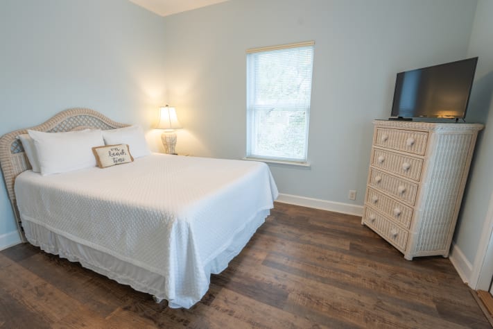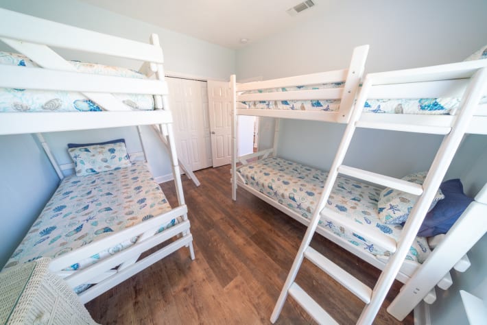 Our first Gulf facing bedroom has a Queen-size bed, flat screen TV and French-style doors which open onto a sundeck overlooking the driveway with peek-a-boo views of the Gulf. Across the hall is our bunk bedroom with 2 single bunk beds which can sleep up to 4.