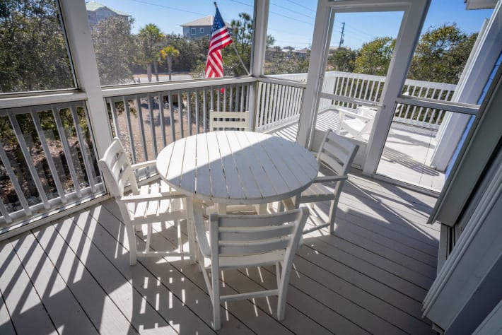 The open living room is a great gathering space for family with a large, flat screen TV and Bluray player, 2 large sofas and plenty of board games for evenings spent together. The living room opens onto the furnished screened-in porch, a cozy place to enjoy lunch or dinner while listening to the crashing waves.