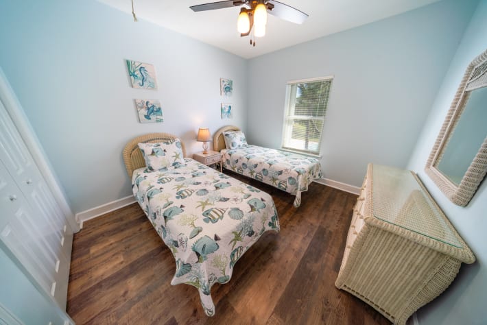 On the opposite end of the house is the second Gulf facing bedroom with Queen bed which also opens onto a sundeck and our fourth bedroom has 2 twin size beds. All bedrooms have plenty of closet space, fresh bedding and natural light. Both bathrooms are accessible from the main living quarters, just outside the bedrooms, and have combination tub/showers with grab bars for safety.